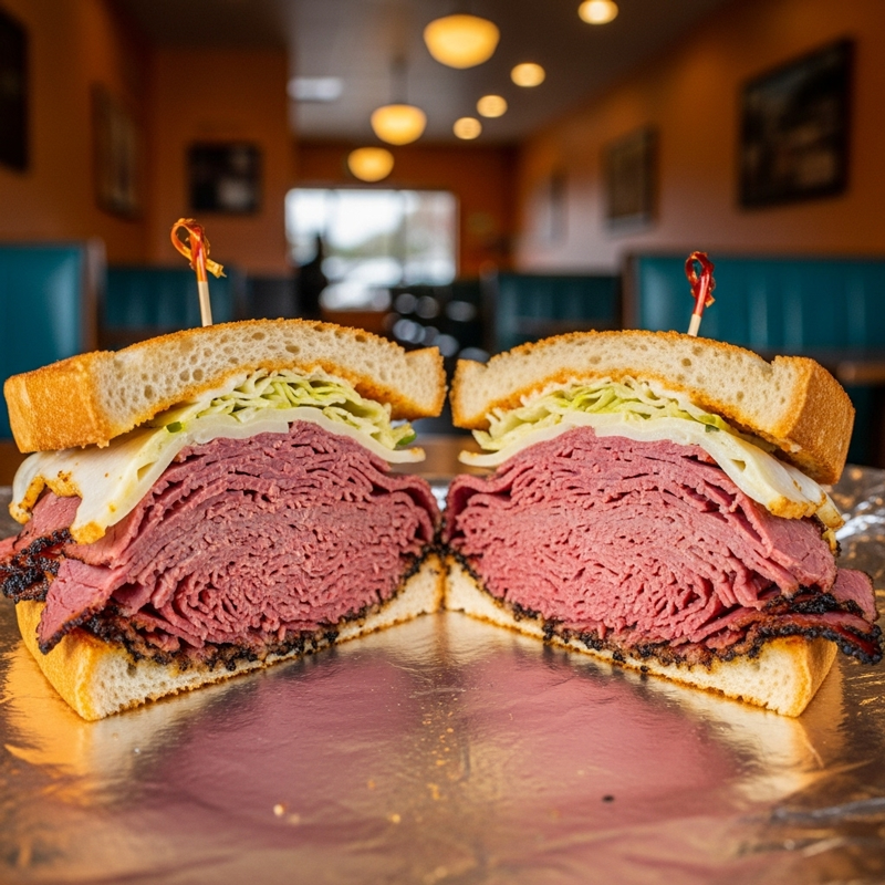Hefty portion of corned beef and pastrami piled high on your choice of bread — customize your perfect sandwich today.